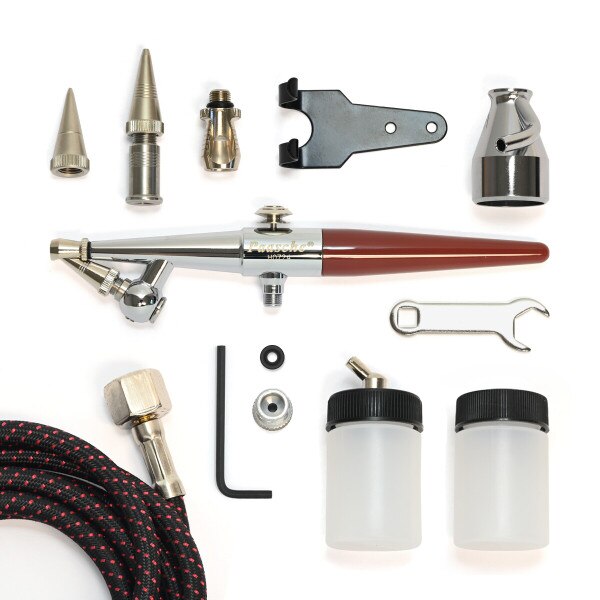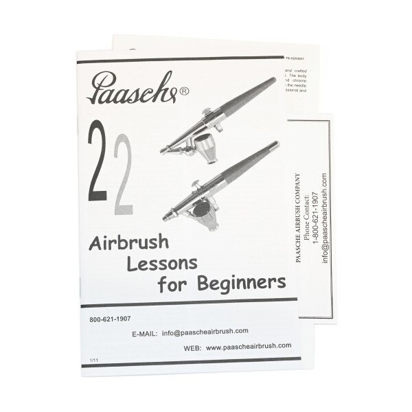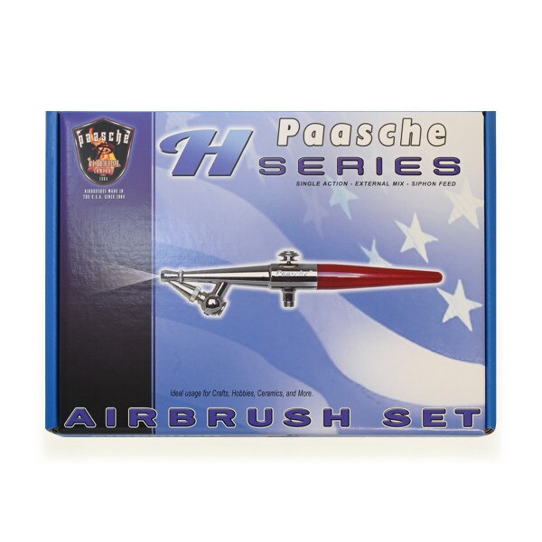 The Paasche “H” series airbrush kit is the world’s most popular airbrush kit and recommended for all skill levels. It achieves spray patterns from fine detail to broad coverage handling medium fluids. Includes a H1 single action siphon feed airbrush, metal color cup, bottle, cap, hanger, wrenches, 6' air hose and “22 Airbrush Lessons” booklet. Includes H1,3 and 5 aircaps for more fluid control.