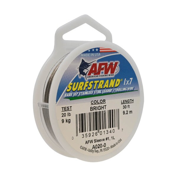 Surfstrand uncoated leader wire has 7 individual strands of stainless steel wire wrapped together to form a tough, flexible leader. 30 Foot spool. Surfstrand is available in bright and brown finish.