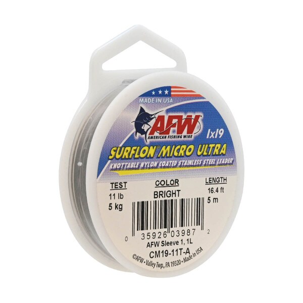 American Fishing Wire Surflon Micro Ultra leader wire is more flexible than our regular seven strand wire. The thin nylon coating on the Micro Ultra adds kink resistance and longer life. Secure the ends of the leader wire using your favorite knots or with leader sleeves. 5 meter (16.25 feet) pack.