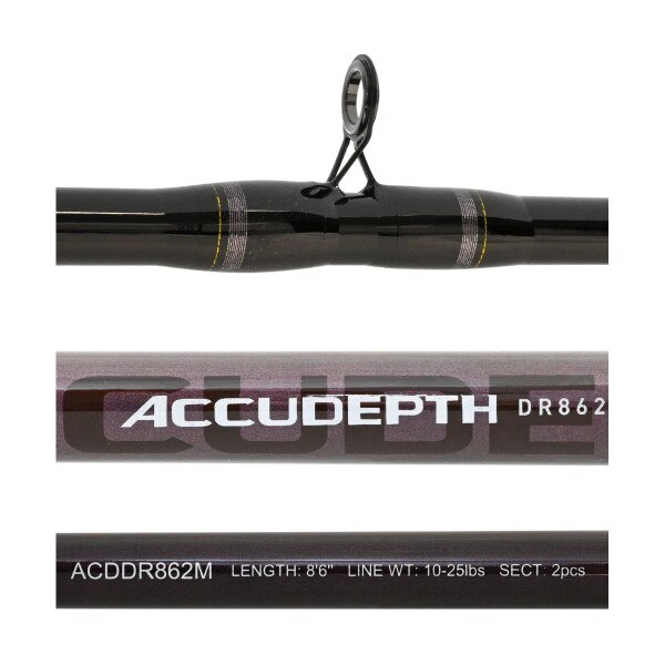Daiwa Accudepth Downrigger Trolling Rods use legendary Daiwa quality and premium components to create one of the most popular trolling rods on the market today. The Accudepth ACDDR862M is an 8'6", medium, slow action, two piece trolling rod featuring durable aluminum oxide guides with a graphite composite blank construction for excellent bite detection. Designed for use with downriggers, but excels in a variety of trolling applications. Air Foam grips are comfortable and resist damage from rod holders. Two Piece. Handle Length 22.5". Line Weight 10-25 lb. 10 Guides. One Year Limited Manufacturer's Warranty.