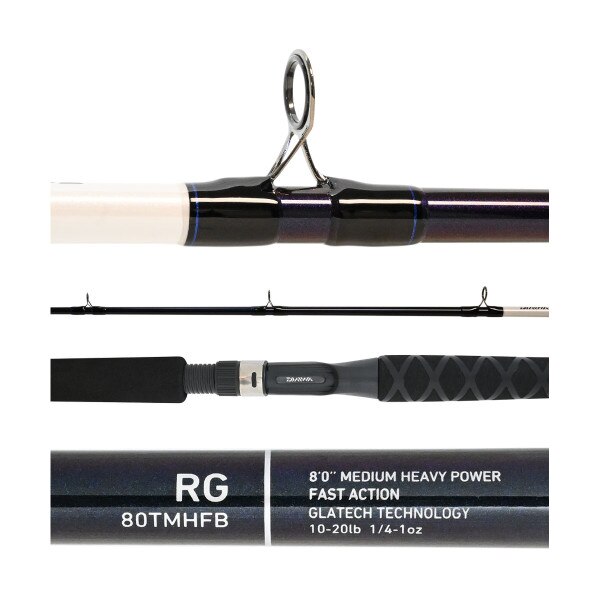 Daiwa RG Trolling Rods offer high-end styling and premium components to suit even the most demanding anglers. RG80TMHFB Rods are a 8'0", medium heavy, fast action telescopic trolling rod built with Daiwa composite Glatech construction, giving these rods ample power with enough give to keep fish hooked. Power Lift triangular foregrip provides the best gripping surface in cold or wet conditions. X-Tube rear grip protects from damage from rod holders. Collapsed Length 7'1". Handle Length 22". Line Weight 10-20 lb. Lure Weight 1/4-1 oz. 10 Guides. Limited One Year Manufacturer's Warranty.