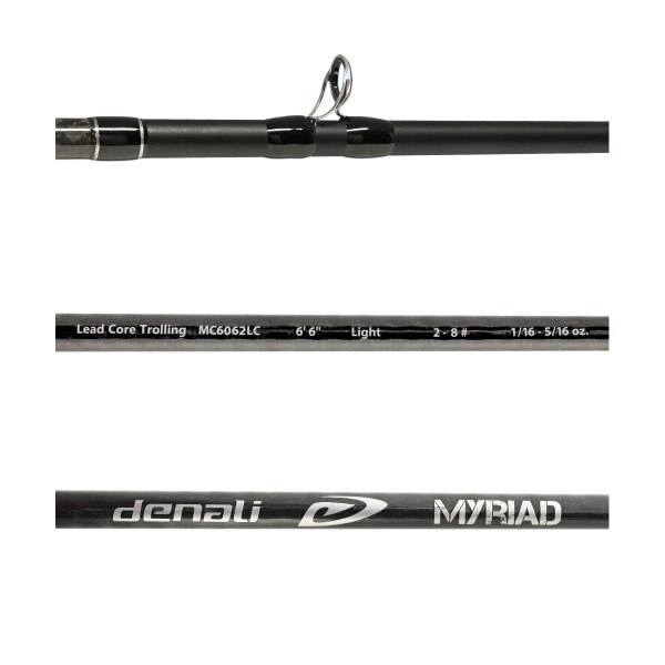 Myriad Leadcore Trolling Rods feature all the cutting edge technologies anglers have come to love in Denali rods, designed for use with leadcore line. Myriad MC6062LC 6'6", medium, moderate action rods utilize tough stainless steel Duraloc guides, IM8 graphite blanks for increased sensitivity, exposed blank reel seats, and flocked shrink tube grip materials for non-slip performance in cold, wet conditions. One Piece. Handle Length 21". Line Weight 6-12 lb. Lure Weight 1/2-3 oz. Three Year Limited Manufacturer's Warranty.