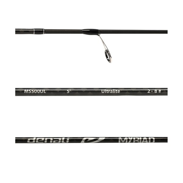 Myriad Series MS500ULXF spinning rod from Denali is the perfect rod for any ultra light fishing applications including Perch fishing on the Great Lakes. Features a High Modulus IM8 Graphite Blank, EVA Split Grips, 304 Stainless Steel Semi-Micro Duraloc Guides, and a wood foregrip for enhanced sensitivity. Myriad Series Rods include all of the cutting edge technologies anglers have come to love in Denali rods. 5’ One Piece, Moderate action, Ultra Light power. Line weight 2-8 lb. Lure weight 1/32-5/16 oz, Handle Length 11 1/4". Limited manufacturer's 3 year warranty.