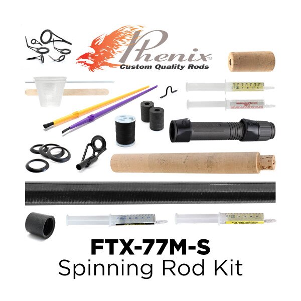 Our FTX-77M-S rod building kit features Phenix's feather Series Rod Blanks, which are composed of cross-weave 36 and 40-ton carbon fiber infused with Nanolite resin. These blanks are well among the most lightweight, sensitive, and responsive in their class, and a favorite among many hardcore anglers. One Piece. 7'7" Length. Medium power. Fast Action. A great rod choice for making long casts with finesse style lures. Each kit includes a rod blank, cork grips, graphite reel seat, handle parts, guides with matching top, epoxy glue, thread and thread finish, stir sticks, brushes, mixing cups and instructions. Some basic tools like sandpaper, razor blades, scissors and a rat tail file (for reaming cork) will be needed.