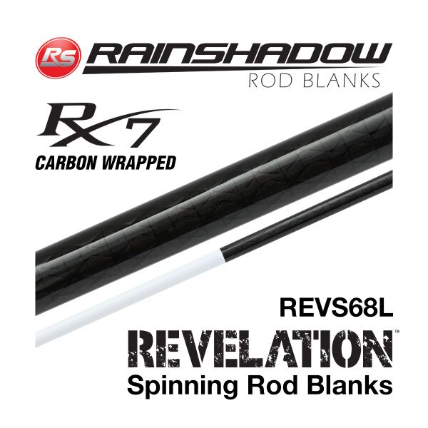 Rainshadow REVS68L-SC RX7 carbon wrapped rod blanks take the features of the Revelation series and add a Carbon Matrix wrap to the bottom 1/3 of each model to add more lifting power and strength while boasting a sleek new look. Spinning rods offer your choice of satin black or gloss white tip. REVS68L-SC one piece 6’8” Light, Moderate action spinning rod blank is rated for 4-10lb. line and 1/16-1/4oz. lure weight making it great for panfish and trout fishing. .386” butt, 5.0/64ths inch tip. 1.4oz blank weight.
